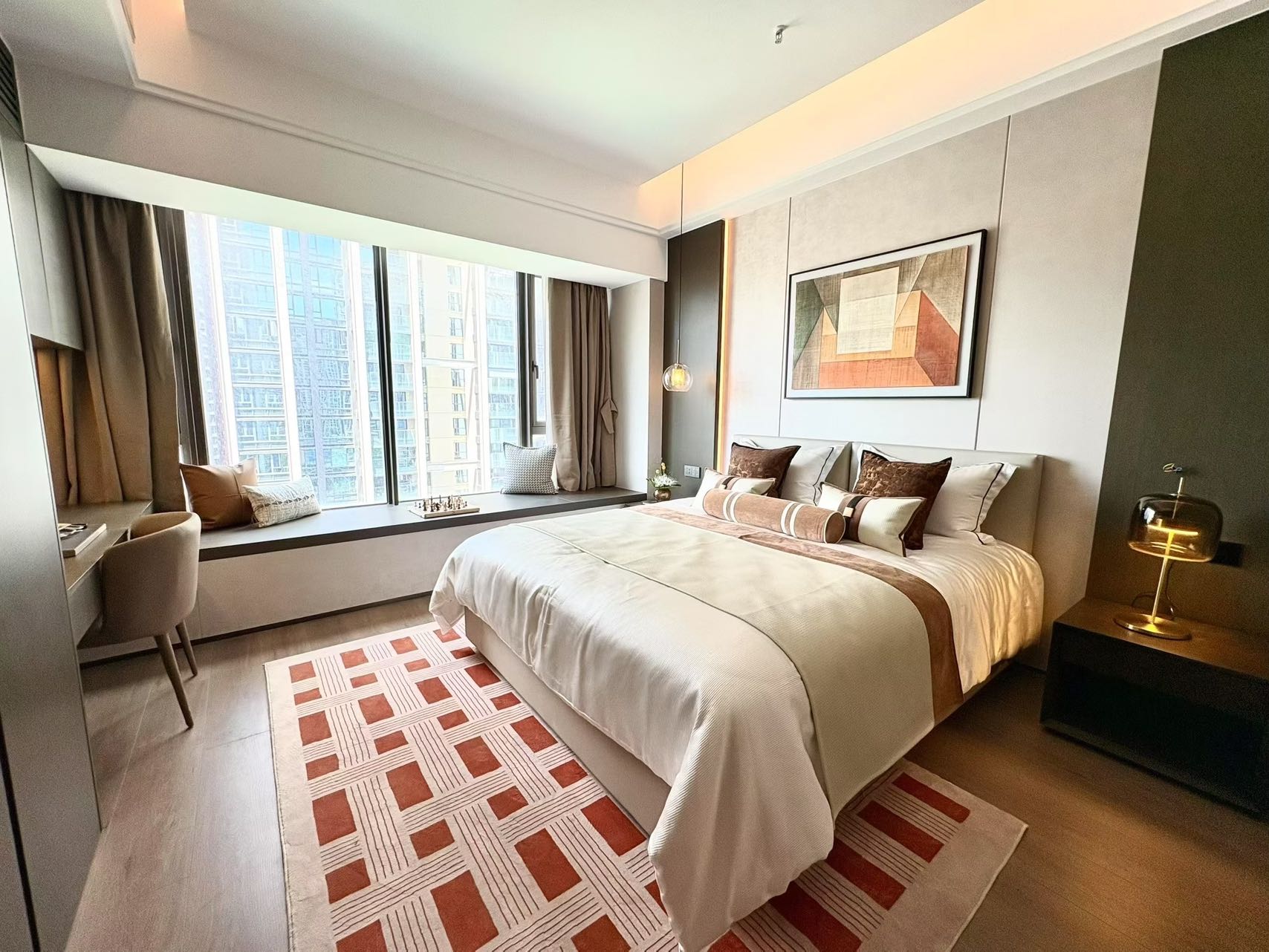 客厅内沙发,茶几,电视,冰箱,洗烘一体洗衣机一应俱全;半开放式厨房的电磁炉,油烟机,微波炉让您轻松简单的完成每日料理;卧室双人大床,定制衣柜,超大落地窗给予十足的视野享受;干湿分离的独立卫生间,保障日常清爽便捷。中央空调及300m独立宽带也必定是房间的标配