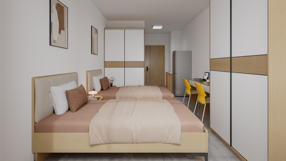 ·双床设计,同事好友合租,是企业员工宿舍优选 ·空间利用率高,双书桌 + 双衣柜,两人同住互不打扰,采光通透不压抑