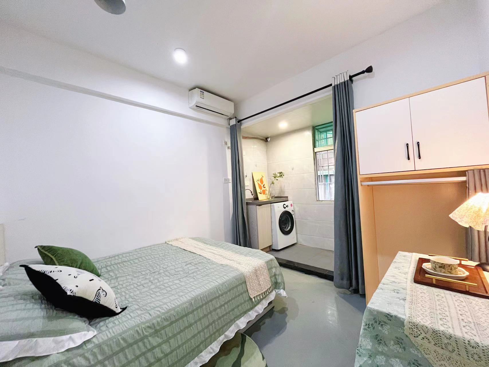 该房间家具家电齐全,可拎包入住,独立卫浴、开放式厨房,满足生活所需 ,原木色装饰低调实用 ,通透大窗,视野开阔